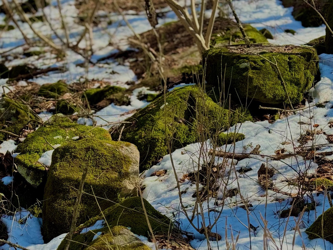 Mossy rocks in the snow.
