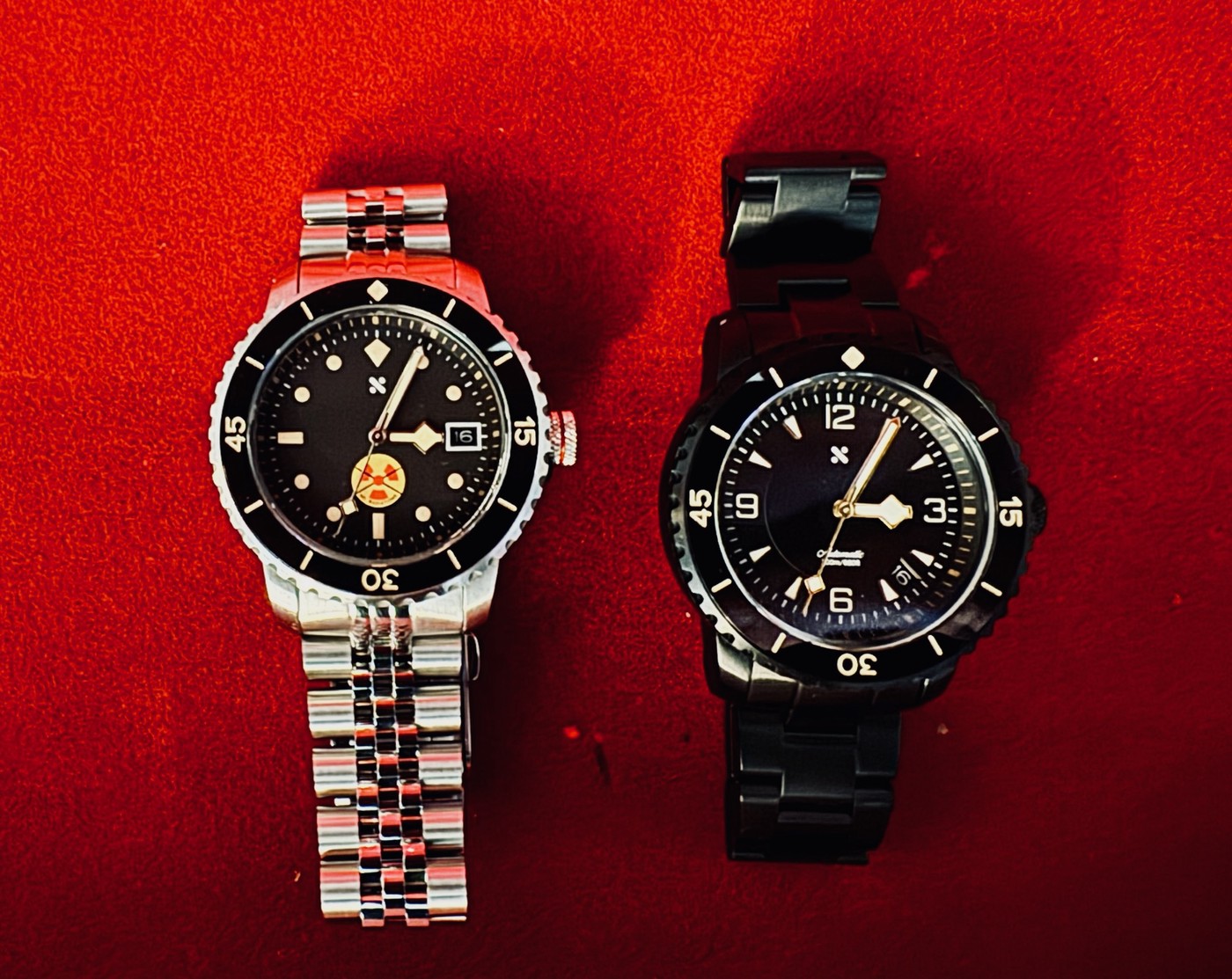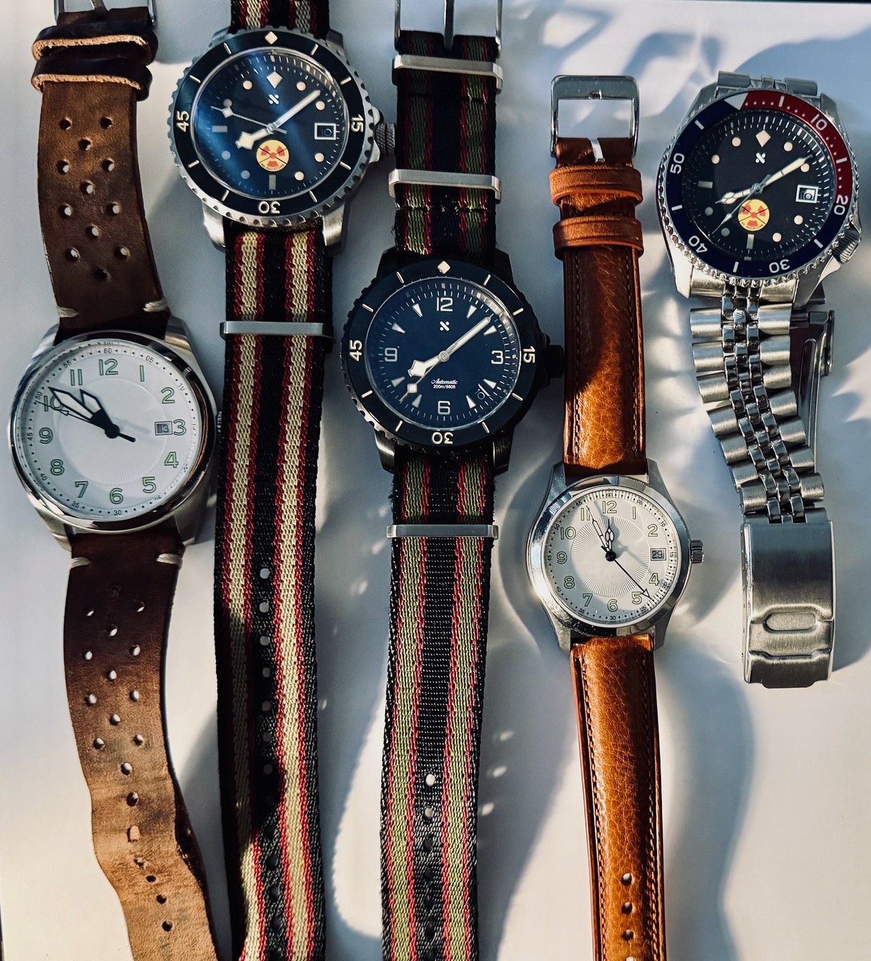 A selection of the watches I've built: the two white faces are Swiss watches, experimenting with different sizes. The others are Seikos basically.